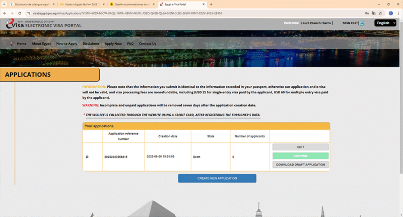 Cómo gestionar el visado para Egipto online – Crear nueva aplicación